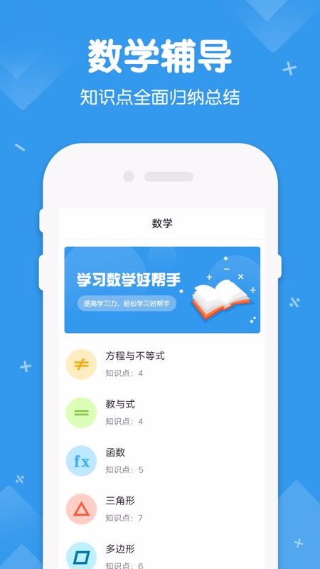 初中数学物理化学app是一个初中知识学习软件,汇集了数学、物理和化学三科内容,让用户一站式学习该知识,并辅助用户完成学习,提高成绩;系统自动根据该三科内容,同步教材知识进行更新,并且知识点全面,涵盖了大部分重点内容,并进行汇总归纳,比如在数学科目中,平台提供了关于方程式、函数、三角形、多边形等学习内容,可以让用户紧扣考点并紧随课表完成学习;因此,想要学习初中数学、物理和化学知识,就可以下载该软件进行查询和学习,让您随时随地在手机中浏览教材内容,并全方位掌握重点知识。
