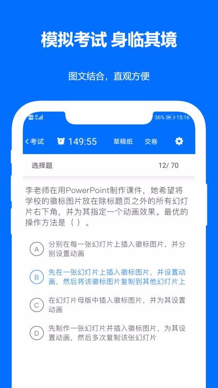 5、体验真实的做题环境,答题页面中为用户展示清晰的题目内容,还提供贴心的倒计时时间工具;