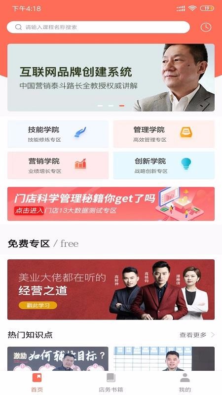 1、划分多种不同的学院专区,首页提供了创新、营销、技能以及管理四个板块学院;