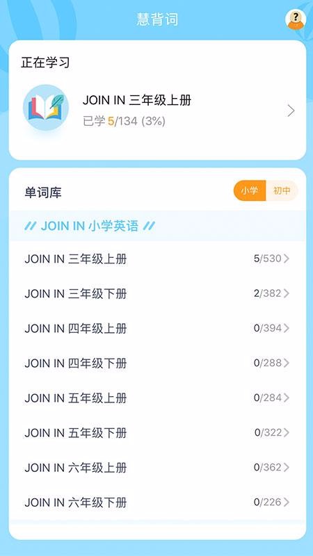 1、选择小学或初中后,即可查看展示的单词库,通过列表展示了各年级的单词;