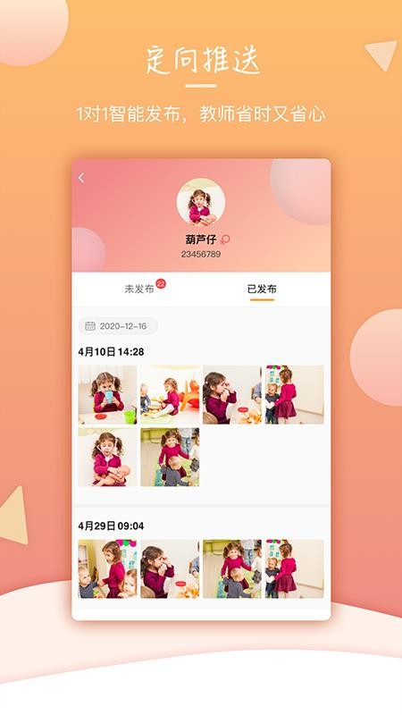 1、提供一对一智能批量发布孩子的日常照片,让老师省心省力;