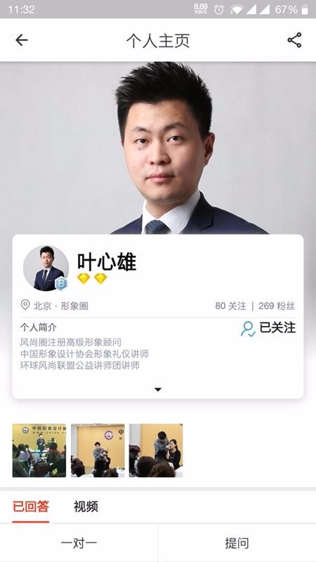 5、还展示了顾问的各种动态内容,比如其已经回答的问题和自己发布的视频等;