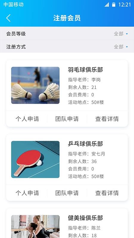 1、为用户提供注册会员版块,用户在这里能够看到各个俱乐部信息,快速申请;