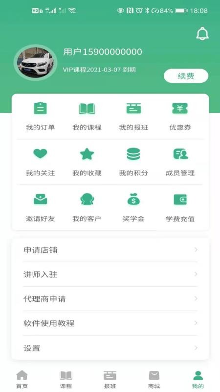 5、打开个人中心,查看自己的各个订单信息,一键充值学费,在线管理各个成员