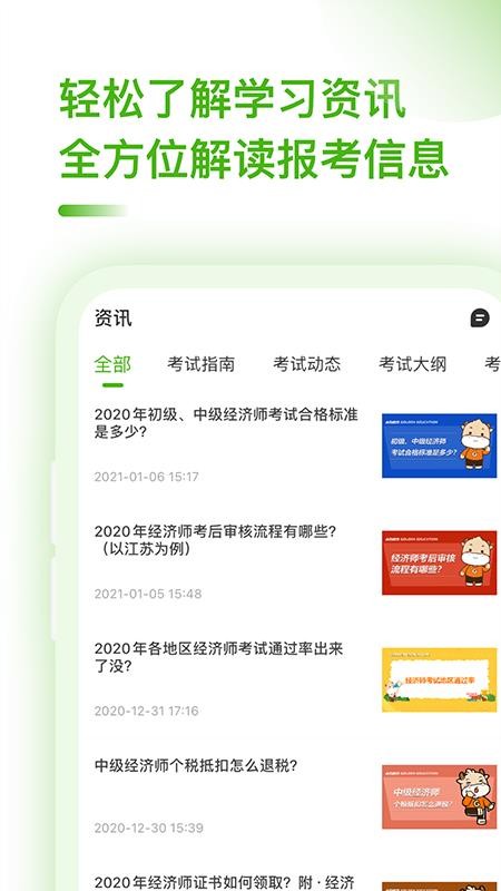 1、设置有考试指南、考试动态、考试大纲等相关经济师考试资讯,全方位解读;