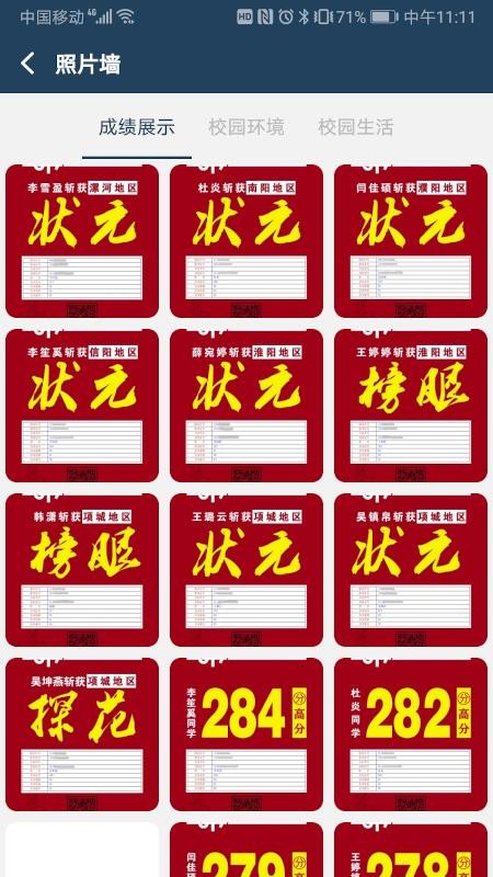 3、进入照片墙版块,查看各种成绩展示、校园环境和校园生活照片,了解教学质量