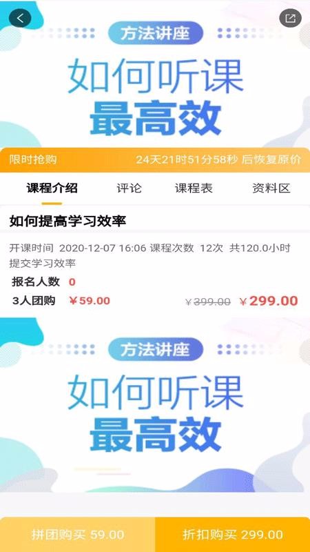 3、提供了各类限时抢购的课程,在规定时间内可以进行折扣购买;