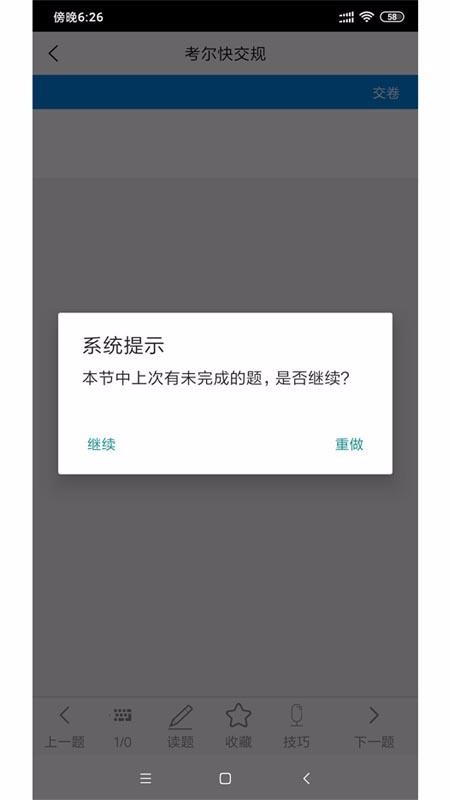 3、进入做题页面里,就可以点击上一题、技巧、收藏、读题等功能进行使用