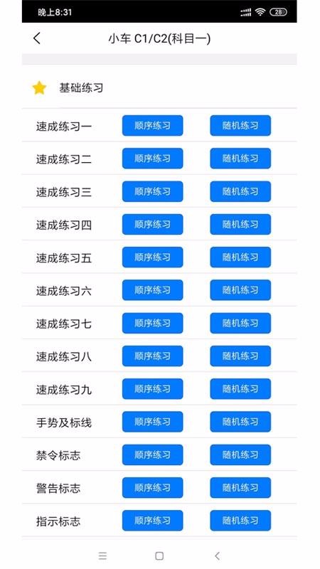 2、拥有多种练习题库,基础练习、专项训练、强化训练、模拟考试等,任意的选择;