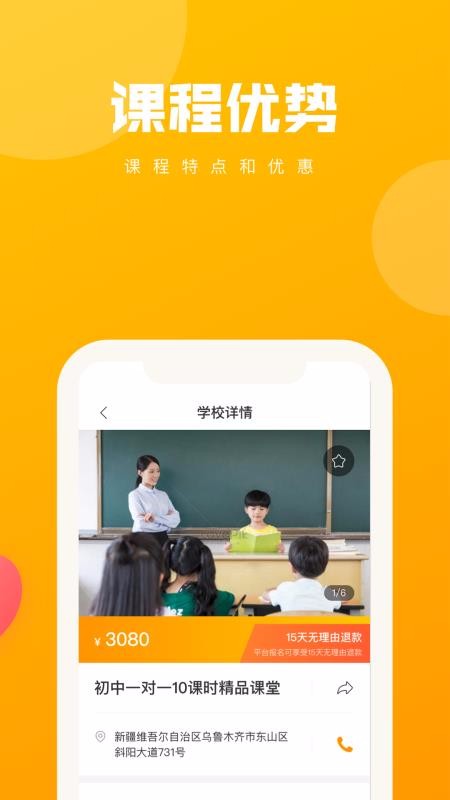 5、丰富多样的学校详情信息,该信息页面展示了相应的课堂内容、课程优势以及教学地址等信息;