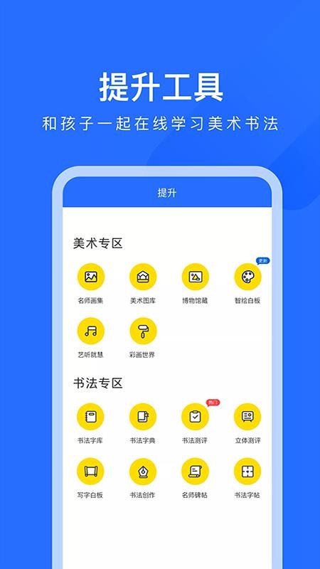3、进入提升版块,通过各种提升工具和孩子一起学习美术和书法知识,快速提升