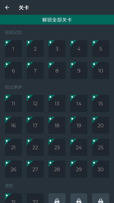 2、划分不同的关卡难度阶段,其中有拾起记忆、初出茅庐以及进阶等不同难度;