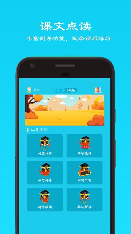 4、在拓展测试页面,用户可以选择趣味跟读、单词拼读、词组找家等测试进行练习