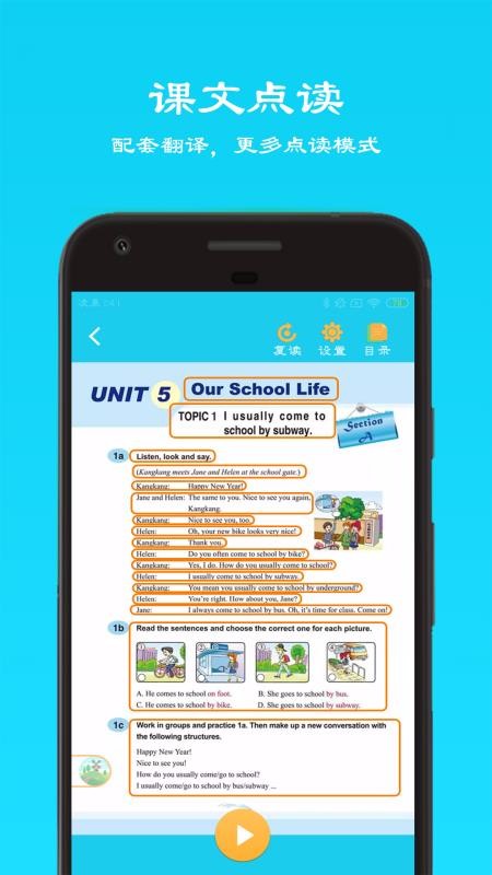 3、选择单元进入点读页面中,自行点击复读、设置、目录等功能进行使用