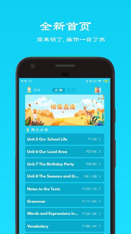 1、支持课文点读,选择单元之后即可查看展示的教材图片,点击英语句子播放读音听;