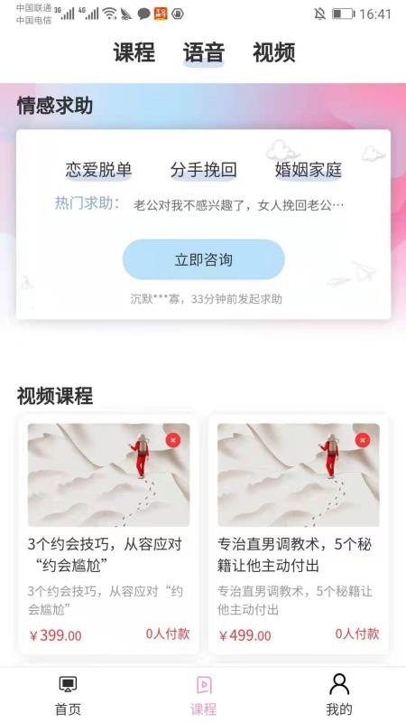 久久情感app是一款情感类的在线学习软件,它为广大用户提供了海量的情感课程,可自由的进行查看,轻松就能了解到课程的详细信息并选择喜欢的课程进行学习,让用户能快速的学习到各种情感知识,帮助用户更好的在一段感情中摆正自己的位置,让更多在爱情中迷茫的人们找到方向,及时挽回;在这里,用户可通过多种支付方式,快速的购买各种感兴趣的视频课程,购买成功后,就能迅速的进行观看,学习到课程传授的各种恋爱技巧,从容的应对男女之间的各种突发情感问题,非常的具有实用性;还等什么,如果有需要,就赶快下载体验吧。
