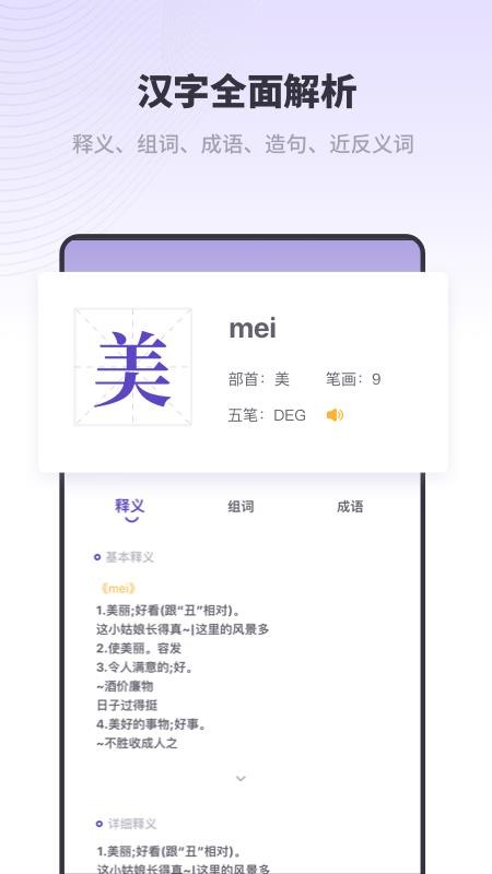 新编字典2020app是一款功能强大的字典和词典,用户可使用该应用,快速的查找各种汉字、短语以及成语,轻松就能进行查看,带给了用户便利;应用拥有多种查询方式,包括了拼音查找、部首查找、笔画查找等等,充分的还原了纸书字典的查询模式,查找更加的迅速,能帮助用户快速的了解到所查询字词的详细释义、组词、造句、正反义词等信息,轻松即可进行学习,学习效率得到显著的提升;同时,每一个字词都拥有真人的发音,能为用户提供专业、标准和清晰的拼读音频,让用户可以迅速的学习到正确的发音方式,非常的具有实用性。