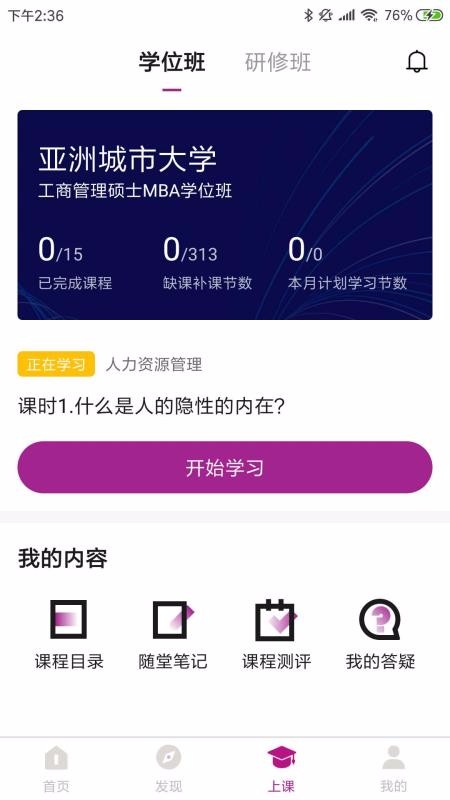 3、加入学位班或研修班之后,即可查看班级课程的学习进度,并了解缺课数、学习计划节数等;