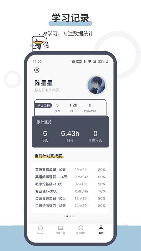 4、为用户清晰显示各个计划的累计完成时长和坚持天数信息,方便用户了解;