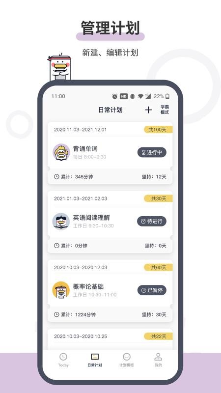 1、用户在软件中能够清晰看到各个计划的详细时间和时长信息,快速了解;