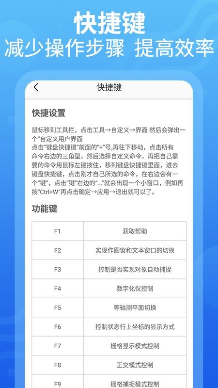 3、快捷键,将各种使用CAD的快捷键展示在用户面前,可自行查看;