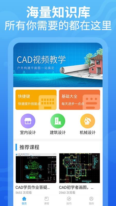 CAD设计教程app是一款线上学习软件,它主要面向CAD设计领域,让用户可以在手机上快速的学习各种CAD知识,将生活中的碎片时间充分的利用起来,提高用户的学习效率,进而迅速的掌握各种CAD使用技巧,提升自己的作图水平;在这里,为用户提供了海量的精品课程,用户可自由的进行查看,轻松就可以了解到课程的详细介绍,并可通过介绍以及结合自身的实际需要,快速的选择合适的课程进行观看学习,让用户能得到针对性的提升,学习起来更加的轻松,非常的具有实用性;还等什么,如果想学习CAD,就赶快抓紧时间下载体验一下吧。