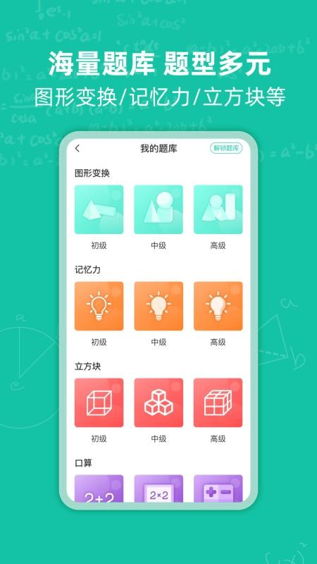 1、提供多元化的课程学习,包括奥图形变换、记忆力、立方块、九空格等;