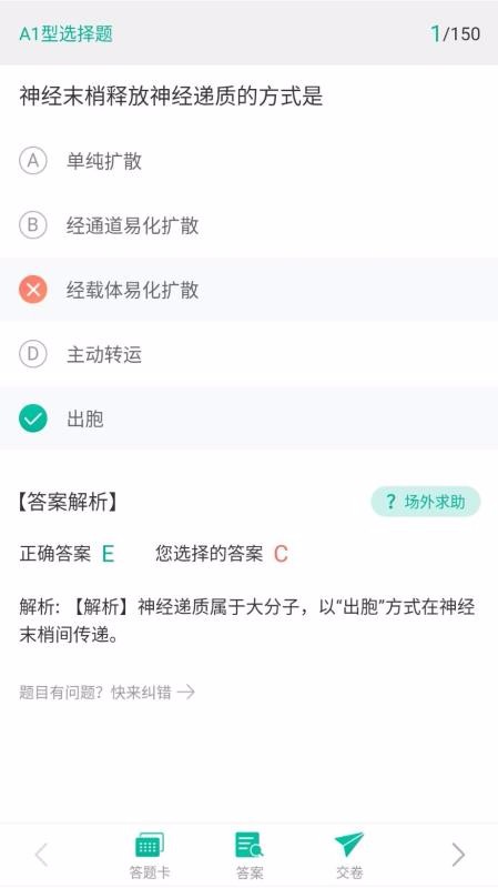 3、在做题页面中,自行点击交卷、答案、答题卡、纠错等功能进行使用