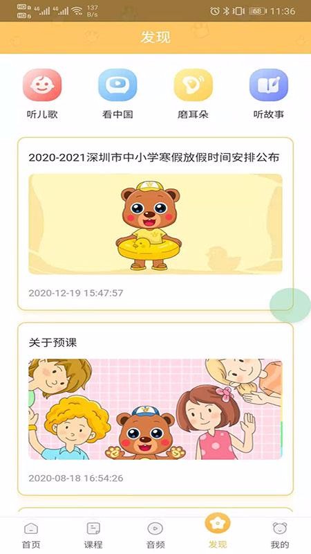 1、丰富的教育资源,这里面为用户提供了音频和视频课程,还有儿歌以及绘本故事等内容;