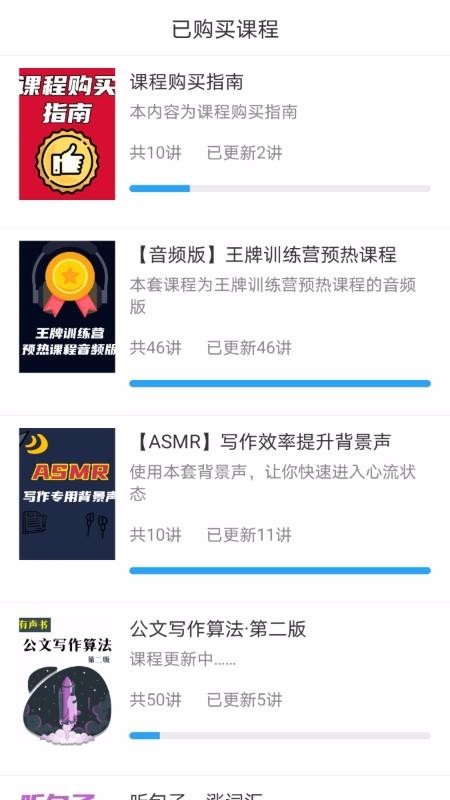 4、进入已购买课程页面后,即可查看购买记录,并了解各课程的学习进度