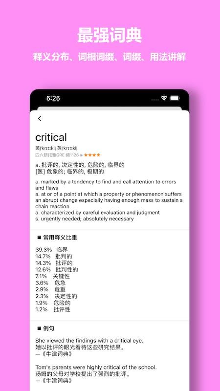 6、在线提供详细的单词学习内容,包括释义分布、词根词缀、用法讲解等;