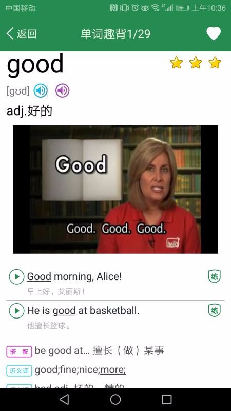 1、收听单词标准的配音,学习单词过程中能点击其中的喇叭收听音频;