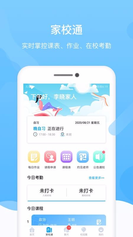 3、实时的校园动态推送展示内容,家校通中还设置当前状态展示标签并展示晚自习等状态;
