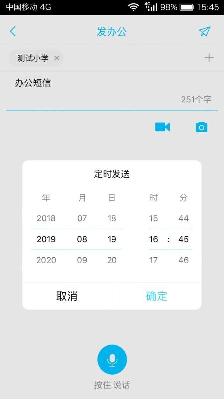 6、用户可使用视频、文字、语音等方式,发布办公短信,根据需要选择;
