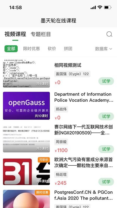 2、提供各种优惠的视频课程,在线立即查看限时优惠、砍价、拼团等不同优惠专区的课程;