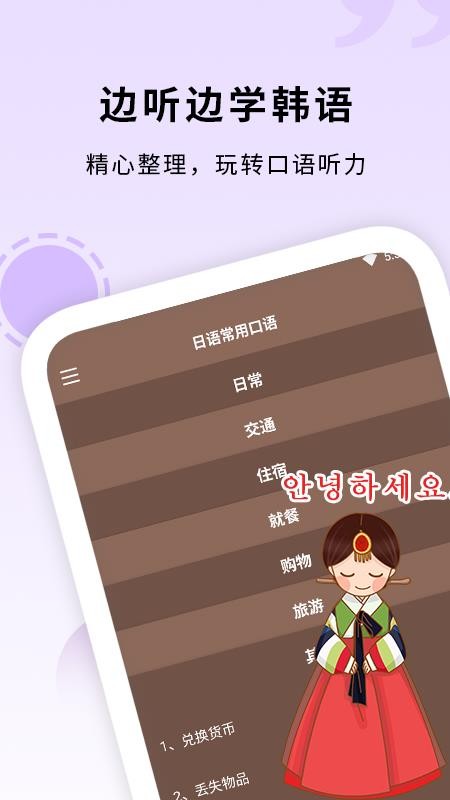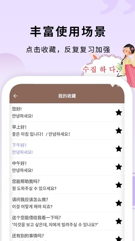 5、丰富的使用场景, 支持了解不同场景模式下的韩语用法,轻松学习韩语;