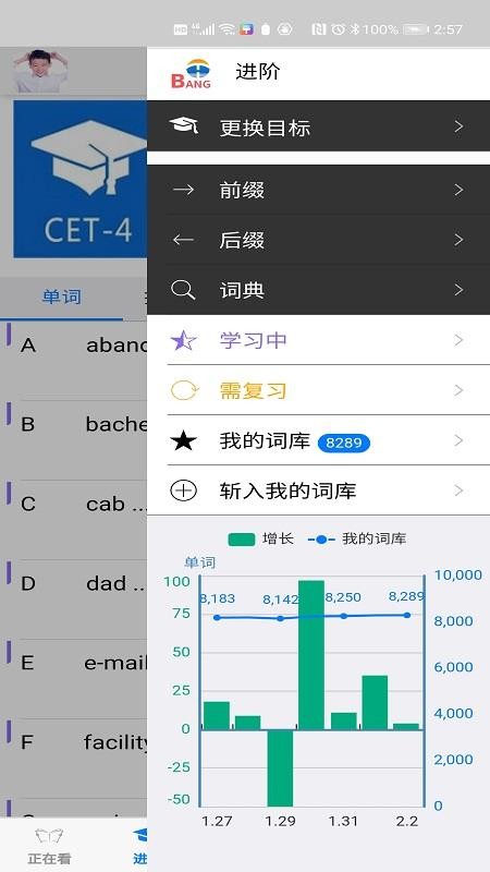 4、进入进阶版块,选择自己的考试目标,在线背诵考试词汇,了解自己的词汇量变化情况