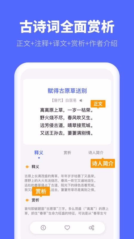 1、全面的古诗词赏析辅助解释,每篇古诗词都拥有释义、赏析以及私人简介栏目;