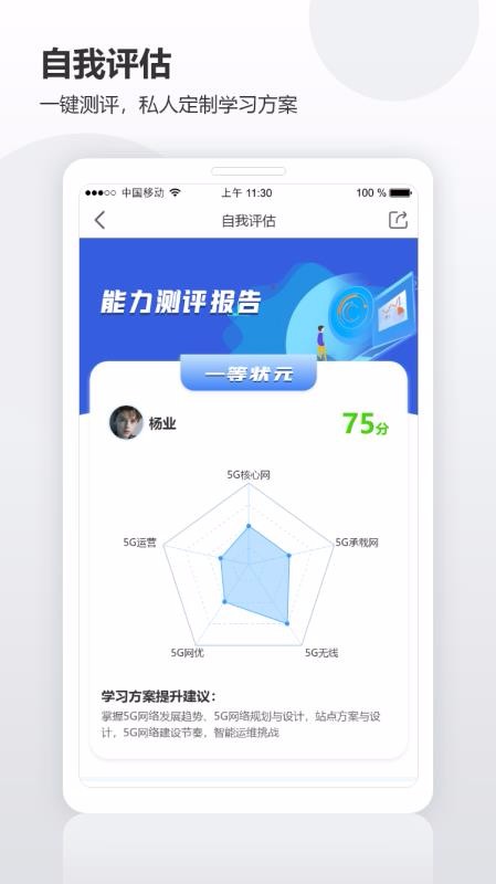 3、支持自我评估,一键完成测评,并了解自己的学习建议和学习方案;