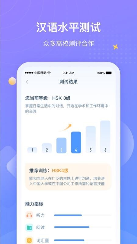 2、根据测试结果,为用户推荐了训练的课程,帮助用户更好的提升汉语水平;