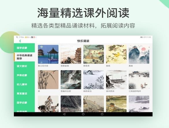 6、点击快乐诵读按钮,就能查看到各类型的课外诵读材料