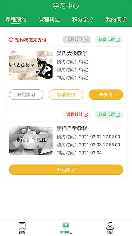 5、进入学习中心,查看课程预约的情况,可以将课程转让