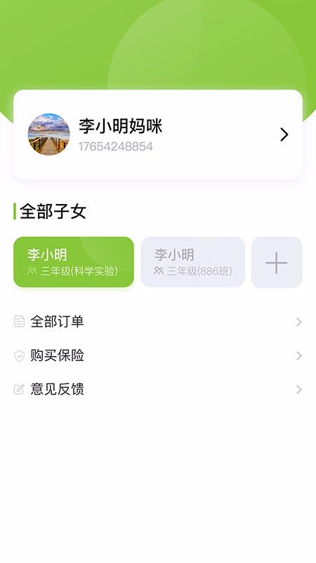 5、进入我的页面后,用户可以选择全部子女、全部订单、购买保险等功能进行使用