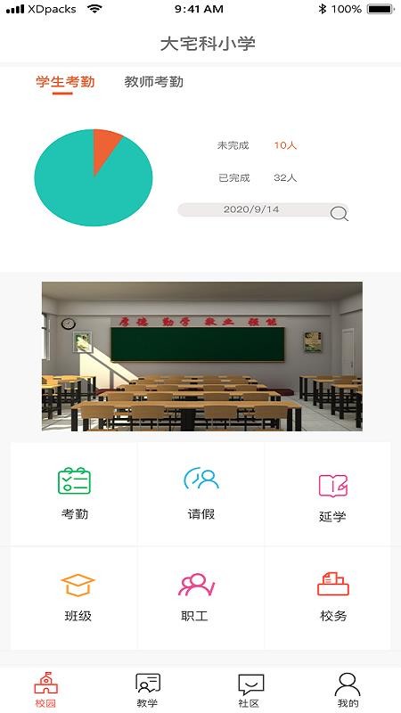 2、进入校园页面,查看学校学生和老师的考勤信息,及时发布公告