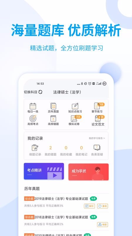 希赛法硕是专门为法律硕士考试提供的备考平台,汇集了丰富的考试知识,并通过直播视频和练习题库的形式进行推送,让用户在线即可完成学习,并随时随地进行刷题练习和视频学习,同时在线学习更加方便,时间也不限,也满足了多样化的学习需求;该平台中的课程和题库都是经过筛选的,随时更新学习内容,并量身定制学习计划,可以让用户针对性的学习,全面解决考试问题,同时拥有贴心的学习包附加服务,用户可以在线参与优秀学员分享会,共同交流学习经验,让你备考不再孤单,并且可以增加学习的趣味性,让你快乐学习。