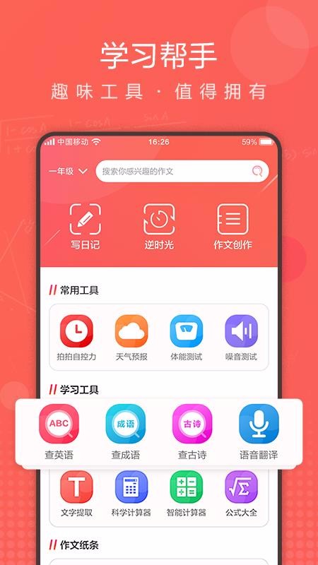 1、立即点击软件并进入主页,查看其中的工具应用图标和年级阶段