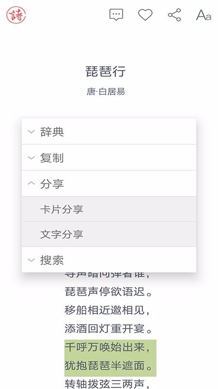 1、支持诗词分享,可以通过卡片形式或直接粘贴文字进行分享;