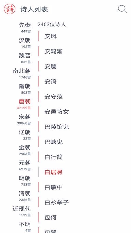 2、进入诗人列表中,选择朝代或诗人即可查看相关的诗词信息