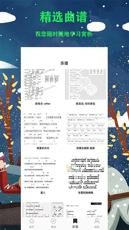 6、为用户提供乐谱版块,用户在这里能够找到各种精选乐谱,学习更多弹唱和指弹内容;