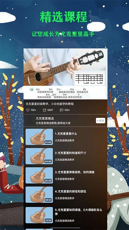 尤克里里课程app是一款尤克里里教学软件,让用户能够学习更多尤克里里弹奏技巧,提高弹奏水平;用户在软件中能够找到多种类型的尤克里里教学视频,在线观看各种视频内容,循序渐进的学习尤克里里弹奏方法,了解更多的音乐基础知识,从而能够轻松弹奏出各种优美的曲子;在这里用户还可以找到各种类型的尤克里里曲谱,通过各种曲谱随时随地的学习更多乐曲弹奏内容,赏析更多优美的乐曲,让自己在学习尤克里里的同时还可以了解更多音乐知识;快下载这款软件试试吧,在线学习各种尤克里里知识,更轻松的弹奏尤克里里。
